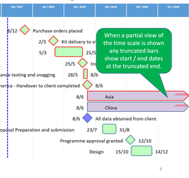Full freedom to choose shapes and colours for summary bar, tasks, milestones and baselines. You can choose different shapes and colours for the start and finish baselines.