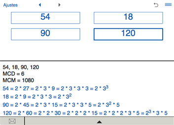Cálculo del máximo común divisor (mcd) y mínimo común múltiplo (mcm) de dos, tres y cuatro números enteros.