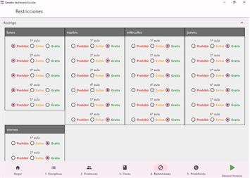 Gestión de Restricciones Horarias: Establece restricciones horarias para los profesores, permitiendo un control preciso sobre los días y periodos en los que cada uno puede impartir clases.