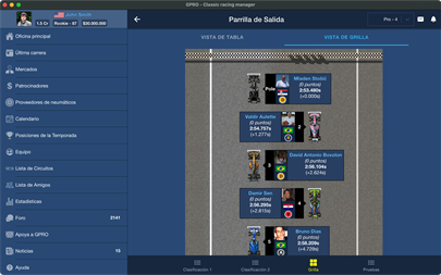 GPRO es un clásico juego de estrategia de carreras a largo plazo en el que se ponen a prueba tus habilidades de planificación, gestión del dinero y recopilación de datos. El objetivo del juego es llegar al grupo Elite y ganar el campeonato mundial. Pero para hacerlo necesitarás avanzar a través de los niveles con muchos altibajos. Estarás al mando de un piloto de carreras y un coche y estarás a cargo de preparar los reglajes y la estrategia para la carrera, al igual que lo hacen Christian Horner o Toto Wolff en la Fórmula 1. Será tu trabajo darle a tu piloto el mejor coche, mientras trabajas con tu personal, pero también tendrá que gastar tu dinero sabiamente. Recopila datos de telemetría de las carreras que haces para mejorar tu juego y darte una ventaja sobre tus rivales la próxima vez que visites una pista determinada.