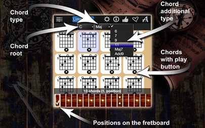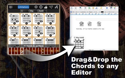App features: - Number of the chords: 10,000, - Possibility to listen to each displayed chord, - Drag&Drop selected chord diagrams into editors (for your own songbook creations), - Supported 56 chord types: Maj, Maj 6, Maj 7, Maj 9, Maj 11, Maj 13, Maj Maj7, Maj Add9, Min, Min 6, Min 7, Min 9, Min 11, Min 13, Min Maj7, Min Add9, Dim, Dim 6, Dim 7, Dim 9, Dim 11, Dim 13, Dim Maj7, Dim Add9, Aug, Aug 6, Aug 7, Aug 9, Aug 11, Aug 13, Aug Maj7, Aug Add9, Sus2, Sus2 6, Sus2 7, Sus2 9, Sus2 11, Sus2 13, Sus2 Maj7, Sus2 Add9, Sus4, Sus4 6, Sus4 7, Sus4 9, Sus4 11, Sus4 13, Sus4 Maj7, Sus4 Add9, 5, 5 6, 5 7, 5 9, 5 11, 5 13, 5 Maj7, 5 Add9, - Authentic guitar chord sound, - All common guitar tunings are available: 1. Standard, 2. New standard, 3. Lute, 4. Half tone flat, 5. Whole tone flat, 6. Half tone sharp, 7. Whole tone sharp, 8. Drop B, 9. Drop C, 10. Drop D, 11. Double dropped D, 12. Celtic, DADGAD 13. DADADD, 14. Open A, 15. Open C, 16. Open D, 17. Open E, 18. Open G, 19. Slide open A, 20. Standard C, 21. Esus, 22. Drop C#, 23. Low C, 24. All Fourth, - Left-Handed player's support, - Volume control.