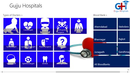 We have realized that in our state [Gujarat] it’s not easy to get information about the hospitals and doctors available in the state. So by this free app we try to help those who are looking for such kind of information. This App is created to get useful information of hospitals, doctors and Blood-banks of main cities of Gujarat at one place. This App contains all informative data about hospitals of different cities in Gujarat. It also provides address, contact numbers, time of service for general as well as single hospital. We also provides Doctor Details that user can search through Doctor’s Type like physician, dentist, etc. User can Search Blood-Banks by City. We have provided Newsfeed that will be helpful to users. So this App helps to them who are not familiar with Medical line or new in that city. By using App Bar user can give Ratings to particular hospital which will help others to refer that details. How to use this App: 1) Just open the App, make sure that internet connection is ON. 2) Now enjoy way of finding proper information regarding Hospitals, Doctors and Blood banks at the same place. 3) To simplify navigation in our App we have added Semantic Zoom (Ctrl + -) by which user will get map of Gujarat and they can select particular city directly. 4) We have added App bar of windows 8 which will provide navigational buttons with Modern UI. 5) User can Share our app information through mail. Features: • Semantic Zoom , Live tile • Filter data by Types of Doctors • Search Hospitals by Cities [of Gujarat] • Search Blood banks by Cities [of Gujarat] • Search Doctors by Cities [of Gujarat] • User can give Feedback for Hospitals