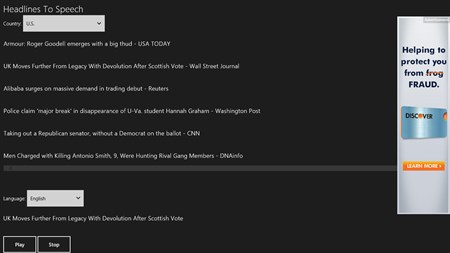 Headlines To Speech will aggregate headlines from news sources worldwide. Using TTS you can listen this headlines. You can click the headline to read detail. You can chose different country and listen in different language.