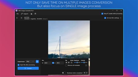 • Rotate image, Vertical and Horizontal Flip image. • Adjust brightness/contrast. • Support option to remove potentially privacy-compromising metadata (EXIF, IPTC, XMP) from image and to keep the output file size smaller. • Simple options "Make Default" for easier usage. • Resize output images (keep aspect ratio and ignore aspect ratio). • Keep PC awake while processing. • Shutdown PC after converting.
