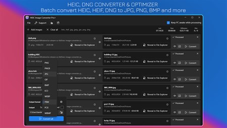 Convert HEIC/HEIF, DNG ProRAW to JPG/JPEG, PNG/PNG8, GIF, BMP, ICO, WEBP, PBM, PCX, WBMP. ???? Convert multiple files at once, there's no limit to how many files. ???? All processing is performed locally on your computer where your files remain safe and private.