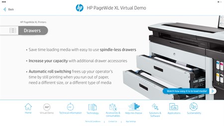 HP PageWide XL Virtual Demo is an easy to use sales tool for HP Sales and HP Partners. It has all the information that the sales staff will need for their client visit, providing easy access and a 360º view of the printer which shows the main characteristics of the product, videos, technical data sheets and documentation which is continually updated with the most up-to-date version. With this tool you can compare products in the HP PageWide XL family, accessories, catalog of applications, information on HP services and the ability to share valuable information with your client and much more