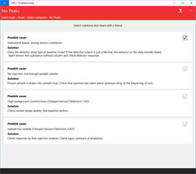 The Thermo Scientific HPLC Troubleshooting Guide App is an extensive tool to effectively diagnose various potential issues with HPLC analysis. Solutions range from general nature issues that are common to standard instrument setups from various manufacturers to troubleshooting special technologies such as nano LC, fluorescence and charged aerosol detection.