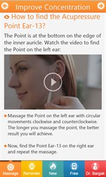 + You do not need to resort to medications. + You do not need to spend a considerable amount of money. + There is no danger of being hurt, infected or experiencing pain. + You massage the points gently with your own finger. + The app reminds you automatically of your massage appointments.