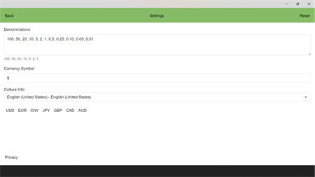 This is a calculator for cashier or banker. End of day, you want to know how much money in the drawer. This calculator will help you quickly. You can print a result report. Multiple languages, multiple currencies. You can set up the currency you want.