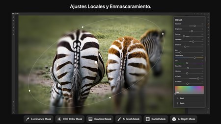 • Ajustes locales. Realice cambios locales con máscaras y pinceles. Aplique máscaras radiales, de degradado, de pincel, de luminancia y de profundidad. Inserte superposiciones personalizadas en el área seleccionada.