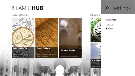 - Daily Hadith : Every day a new hadith (english / german) - Daily Quran : Every day some new verses of the quran in arabic, transliteration and its meaning in english and german (no internet connection needed) - Do you know? : Gain new knowledge on a regular basis - Quran Karim: Browse the whole holy quran in arabic, german, english and transliteration (with audio recitation) -Hadith Database: isA growing hadith database in arabic, german, english and with audio
