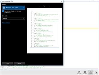 Json Formatter is a windows store app. It can not only open, edit, save, print JSON file but also format JSON string. -- Auto format the JSON string -- Improving the readability of the JSON. -- Auto validate JSON String. -- Drag and drop file. -- Auto display File Lines and columns.