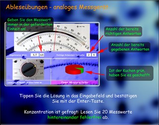 Ableseübungen - analoges Strommessgerät: Skalenwerte werden am Bildschirm angezeigt und müssen richtig abgelesen werden. Dabei wird auch das Umrechnen der Größen µA, mA und A trainiert.