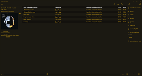 Funciones: -Control total de lista de Reproducción (Quitar canciones, orden de archivos, orden, mezcla) -Dos diferentes vistas: -Vista de Reproducción -Reproducción del Momento con soporte de desliz -Añade canciones de una carpeta Específica (Incluye carpetas de Otras) -Búsqueda de Audios -Ver canciones por: Título, Artista, Album y género -Añade canciones de la memoria SD -Descarga música y reproduce música de OneDrive -Vista de la Caratula del Album -Muestra de la Letra de mp3 Tag -Control de Volumen dentro de la Aplicación -Guardado automático de listas -Soporte para múltiples temas -Guarda listas ilimitadas -Recuerda la última posición de la Reproducción -Comparte Canciones individuales de cualquier lista -Comparte diferentes canciones de la Biblioteca -Soporte de Audio FLAC