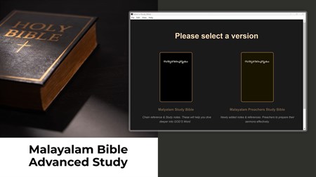 Holy Bible 1 - Malayalam Study Bible Chain reference & Study notes. These will help you dive deeper into GOD’S Word. Holy Bible 2 - Malayalam preacher’s study bible Newly added notes & references. Preachers to prepare their sermons effectively.