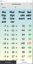 Mit der App wird das Kopfrechnen trainiert. Sie erzeugt Zufallszahlen, deren Bereich individuell eingestellt werden kann, mit denen dann die 4 Grundrechenarten geübt werden. Es wird eine einstellbare Zeitspanne von 1 bis 60 Sekunden vorgegeben um eine Rechenaufgabe zu lösen. Es werden 3 oder 5 Lösungsvorschläge angezeigt, aus denen die richtige Antwort in der eingestellten Zeitspanne ausgewählt werden muss. Es können mehrere Durchläufe eingestellt werden, die dann die Ergebnisse in einer Liste mit richtigen und falschen Antworten auswerten. Die Listen können, wenn gewünscht, auch gespeichert werden.