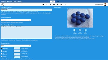 Das Medizinbuch erinnert Sie an Medikamenteneinnahmen und Arzttermine über Benachrichtigung und Live Tile Darstellung. Zu Medikamenten, Allergien, Arzt- und Zahnarztbehandlungen und weiteren können Sie zusätzlich zu Ihren Eingaben Fotos und Bilder aufnehmen.