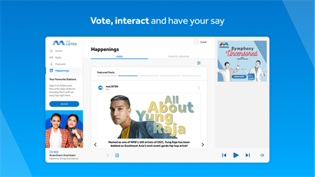 Enjoy a personalised and interactive digital experience on meLISTEN: - Picking your groove for the day? See what's playing across 12 Mediacorp radio stations at one glance - Quick play of your favourite radio stations with just one tap - Select from a wide variety of original podcasts which feature uniquely local content and more - Missed your favourite radio programme? Search for your favourite radio programme in the podcast section and listen to it on demand - Discover new local music, listen to your favourite drama OSTs on repeat to your hearts’ content with music playlists made for you - Enjoy seamless podcast playback across devices from where you left off - Follow your favourite radio stations and podcasts to receive first-hand updates on their latest content and happenings