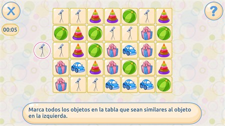 1. "Encuentra Todos los Objetos" (tarea de corrección) - Desarrolla la concentración 2. "¿Quién Tiene Qué Número?" - Entrena la memoria 3. "Encuentra los Números" (Mesa Schulte) - Aumenta la cantidad de memoria operativa 4. "Paleta" - Mejora la memoria 5. "Memoriza la Imagen" - Desarrollo de la memoria 6. "Reacción" - Para entrenar la selectividad de la atención 7. "Cartas de Memoria" - Entrena la memoria