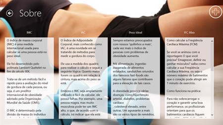 Minha Saúde é um aplicativo para calcular 4 índices importantes e bastante usados para auxiliar na busca pela forma física saudável. Os índices calculados são: IMC (Índice de Massa Corporal), IAC (Índice de Adiposidade Corporal), Peso Ideal e ICM (Índice Cardíaco Máximo). Para saber mais sobre cada índice, clique com botão direiro e clique no botão Sobre.