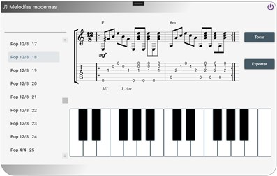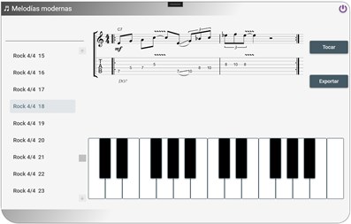 Melodías modernas es una aplicación que reúne una colección de melodías muy interesantes que abarcan estilos musicales desde el Pop hasta el Rock principalmente. La aplicación te brindará una base sólida para crear melodías musicales para tu próximo éxito o tu proyecto musical de afición. Desde la aplicación puedes: * Ver cada línea melódica como una notación en tablatura * Reproducir las melodías * Exporte melodías en formato .midi para usarlas en su estación de trabajo de audio digital favorita o software de notación * Toca tus propias melodías de piano en un teclado virtual con sonidos de piano ultra realistas.