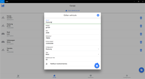 Aplicación para gestionar los mantenimientos de los vehículos personales sin necesidad de recordar cuándo se realizó una revisión y cuánto queda para el siguiente cambio de aceite de su moto o coche.