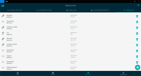 Tutorial breve: 1.- Pestaña "Vehículos": Añade tus vehículos. 2.- Pestaña "Operaciones: Añade las revisiones, compras, etc. realizadas a tus vehículos. *Importante: Debe indicar las piezas sustituidas para que las notificaciones se calculen correctamente. 3.- Pestaña "Inicio": Ya se puede ver las notificaciones de vida de las piezas de tus vehículos. 4. Pestaña "Configuración": Personalizar los mantenimientos de los vehículos creando configuraciones especificas para cada vehículo.