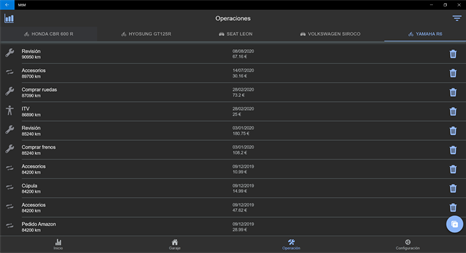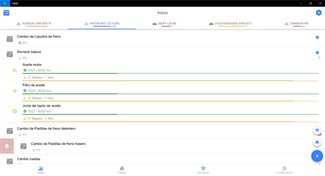 Tutorial breve: 1.- Pestaña "Vehículos": Añade tus vehículos. 2.- Pestaña "Operaciones: Añade las revisiones, compras, etc. realizadas a tus vehículos. *Importante: Debe indicar las piezas sustituidas para que las notificaciones se calculen correctamente. 3.- Pestaña "Inicio": Ya se puede ver las notificaciones de vida de las piezas de tus vehículos. 4. Pestaña "Configuración": Personalizar los mantenimientos de los vehículos creando configuraciones especificas para cada vehículo.