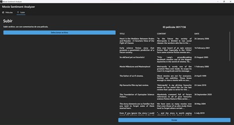 Aplicación que analiza los comentarios realizados en la web de IMDB sobre la películas y muestra si las opiniones son positivas, negativas o neutrales sobre las películas con la ayuda de OpenAI. Además, permite importar nuevos comentarios sobre alguna película en específico y analizarlas para luego mostrar los resultados en la aplicación.