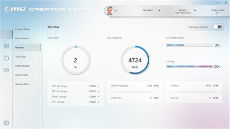 MSI Creator Center is designed for creators to enhance user’s experience on MSI devices. With MSI Creator Center you can monitor and optimize your system performance, and it is easy to set up, with simple clicks to change the user scenario, display color mode, sound effect, LED backlit color and more. Move seamlessly across MSI devices with the new Innovative UI and be confident that you can inspire your creativity. [Important]: Features may vary by product.