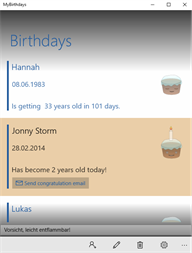 Did you ever forget the birthday of your family members or friends? Search for an easy way to get reminded by your phone or win 10 device? Then the MyBirthdays app is just right for you!