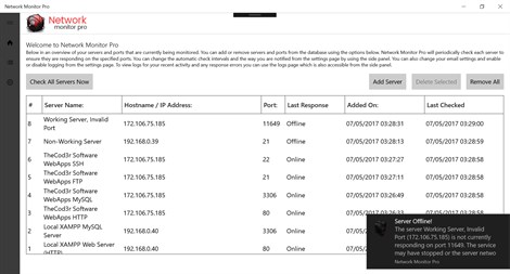 Stay alert and actively monitor your entire network from home, in the office, on the go and even while you play games! Network Monitor Pro allows you to add as many networks as you need to and monitor the individual ports and services with just a few clicks. Simply add a new server to the database and the app does the rest. Easily monitor various services for your websites or office networks, as long as they have a port number you can monitor it. Some examples include: HTTP (Web Server), FTP Server, MySQL Database, SSH, cPanel & WHM, Mail Server and much much more! The limits are endless.