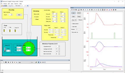 HODGKIN-HUXLEY is a direct implementation of the original Hodgkin-Huxley model of a nerve impulse. It operates in either current clamp or voltage clamp mode, each with square or ramp waveform and user-defined amplitude and timing. A wide range of phenomena can be simulated, including refractory period, threshold accommodation, voltage clamp tail currents, single channel patch clamp conductances and many others. Various drugs can be applied, and the temperature and ionic concentrations can be varied.