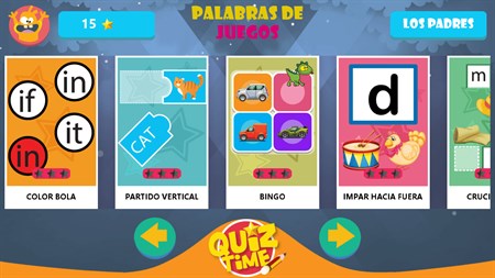 ** Lista de juegos color bola, Partido Vertical, Bingo, Impar hacia fuera, crucigrama, Completa Las Palabras, palabras que riman, carta cuadrícula, Reconocimiento de Palabras