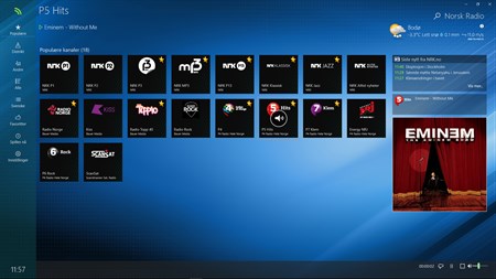 Oversikten "Spilles nå" viser hvilket program eller låt som spilles i øyeblikket for alle kanalene. Fullskjerm spillemodus med valg av bakgrunn (kun for Windows Desktop).