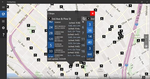 OneAppAway is a Windows 10 client for OneBusAway that has additional features. This app works on Windows 10 PCs and phones. In addition to most of the features of the official OneBusAway apps, OneAppAway allows you to download maps for offline use, it has more data saving features that you can enable, and presents data in a useful and Windows 10-like style. Once you download offline maps to your device in settings, those offline maps can be used in OneAppAway as well. This is the initial release, and I am still working on extra features for future releases. If there's a feature you would like to see, tell me and I'll consider it.