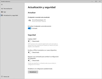 Actualización y seguridad • Actualizar firmware • Habilitar HDCP para hacer streaming de contenido digital con derechos de autor (nuevo)* • Habilitar PIN al conectarte a un nuevo dispositivo • Habilitar contraseña para la configuración del adaptador