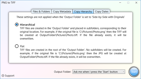 Your conversion, your way. • Create TIFF files in a new folder, optionally preserving the original PNG folder hierarchy. • Create TIFF files side-by-side with the PNG files, with the same filename. • Remove the TIFF metadata (Tags) for privacy • Copy the creation and modification, or use the system dates.