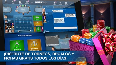 * TORNEOS - Participa en torneos Sit'n'Go y Shootout y mejora tus habilidades. * FICHAS GRATIS - Juega cada día y consigue fichas gratis. * INTERFAZ PRÁCTICA - Una interfaz de usuario sencilla y práctica con la que puedes pasar, no ir, ir, y subir las apuestas con un solo toque. * JUEGA CON TUS AMIGOS - Invita a tus amigos al juego por email o Facebook, y consigue bonus como recompensa. * CONSIGUE RECOMPENSAS - Sube las apuestas, gana manos, juégatelo todo y consigue logros. * CONVERSA CON OTROS JUGADORES - Usa el chat y el sistema de mensajes para discutir las manos que has ganado, y diviértete aún más con el juego. * SIN REGISTROS - Usa el modo invitado para jugar al póker sin registrarte. * APRENDE A JUGAR - ¿Eres nuevo en esto del póker? ¿Siempre has querido probarlo? Nosotros te ayudaremos con tus primeros pasos. Usa el modo tutorial, con el que aprenderás las combinaciones ganadoras y las reglas básicas del juego. * UNA SOLA CUENTA - Juega con tu smartphone o tu tableta y sigue jugando en Facebook sin perder el progreso.