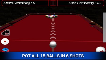 Game Play: - Swipe screen up & down to adjust your view on table before playing shot - You have to pot all 15 balls in given shots - Each successful pot will give extra shot in challenge mode - Set ball movement right, left, top & bottom for spinning ball accordingly - Use chalk on stick for playing proper shots - Set cue ball in D when potted