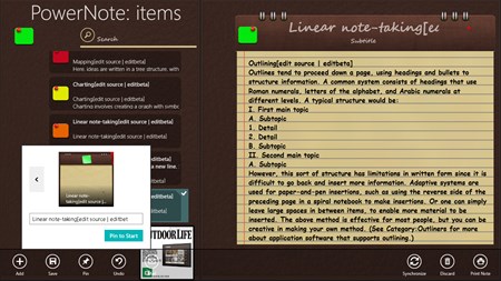 Create/Edit and Store notes quickly in a fancy way? Find notes quickly with instant searching and simple tags? Filter and organize notes quickly with priority stickers? Have your notes everywhere? Need to print all your notes instantly? Power Note is the solution! Using snapped mode of windows 8 now, you can get notes and working at the same time. If you are tired from the advertisements, just buy the paid version.