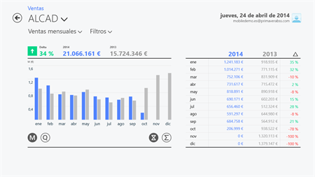Gracias a su integración con el ERP PRIMAVERA, el módulo de Ventas permite consultar información actualizada sobre las ventas de su empresa, en formato de gráfico o tabla y agrupada por periodo, zona geográfica, cliente o vendedor. Dentro de este periodo, esta información puede visualizarse por semana, por mes, por trimestre o en valores acumulados desde el inicio del año, siempre comparado con el periodo homólogo del año anterior.