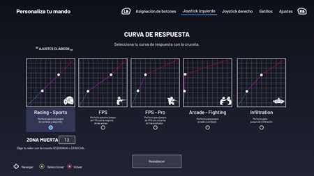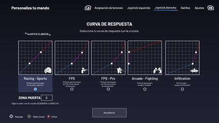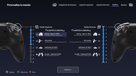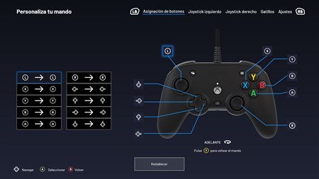 Asignación de botones Sensibilidad de los joysticks y gatillos Invertir los joysticks izquierdo/derecho 4 u 8 D-pad Activación o desactivación de los motores de vibración