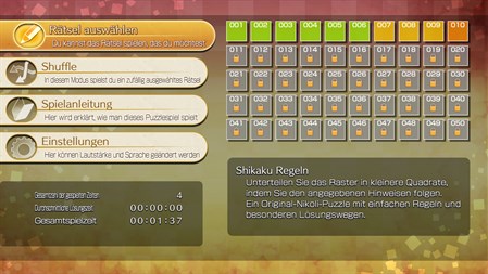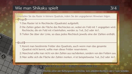 "Shikaku" ist eines von Nikolis eigenen Original-Casse-tête, mit einfachen Regeln und einem einzigartigen Lösungsgefühl. Bis Sie sich daran gewöhnt haben, werden Sie dazu neigen, die casse-tête mit Rätselraten zu lösen, aber der eigentliche Reiz liegt darin, sie mit Logik zu lösen. Wenn Sie erst einmal die Methode beherrschen, die casse-tête durch allmähliches Strecken von Quadraten aus den Zahlen zu lösen, werden Sie "Shikaku" auf einer noch tieferen Ebene genießen können.