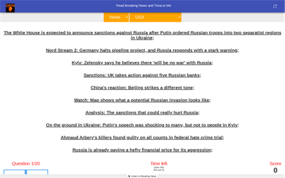 QNN App Features: - Hourly Breaking News and Trivia - Multilingual - Read or Listen to Breaking News - Trivia with Score card and countdown timer - Listen to Breaking News - Select City, Country or Continent for Breaking News - News are aggregated from the top open source news feed worldwide including reddit, twitter, feedspot, instagram, quora, etc. - Breaking News and Trivia available for: world, USA, UK, Canada, Europe, Asia, Latin America, Africa, Oceania and more countries and cities will be added soon. - Truth Social Breaking News and Trivia - Anti Fake News - Direct link to Google to search and verify all breaking news updates - World Breaking News, World History Trivia, World Geography Trivia - Canada Breaking News, Canadian History Trivia, Canadian Geography Trivia - USA Breaking News, USA History Trivia, USA Geography Trivia - UK Breaking News, UK History Trivia, UK Geography Trivia - Europe Breaking News, Europe History Trivia, Europe Geography Trivia - Asia Breaking News, Asia History Trivia, Asia Geography Trivia - Africa Breaking News, Africa History Trivia, Africa Geography Trivia - Oceania Breaking News, Oceania History Trivia, Oceania Geography Trivia - Latin America / South America Breaking News, Latin America and South America History Trivia, Latin America and South America Geography Trivia - Toronto Breaking News, Toronto History Trivia, Toronto Geography Trivia - Vancouver Breaking News, Vancouver History Trivia, Vancouver Geography Trivia - Montreal Breaking News, Montreal History Trivia, Montreal Geography Trivia - Ottawa Breaking News, Ottawa History Trivia, Ottawa Geography Trivia - Calgary Breaking News, Calgary History Trivia, Calgary Geography Trivia - Edmonton Breaking News, Edmonton History Trivia, Edmonton Geography Trivia - Cameroon Breaking News, Cameroon History Trivia, Cameroon Geography Trivia - South Africa Breaking News, South Africa History Trivia, South Africa Geography Trivia - Nigeria Breaking News, Nigeria History Trivia, Nigeria Geography Trivia