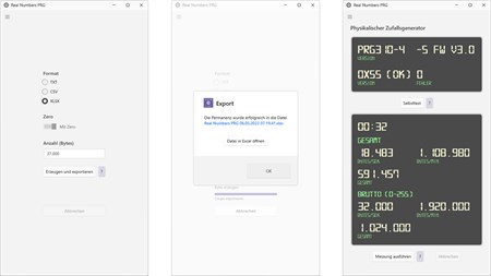 The passed NIST and Diehard tests testify to a high quality of the generated random numbers with an entropy of 7.99996232 at a maximum entropy of 8! The Real Numbers app can also run a bit ratio test and a chi-square equal distribution test.