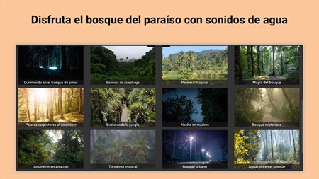 - Chirriando en el bosque - Arroyo en el bosque - Lodge en el estanque - Arroyo en el bosque - Bosques al atardecer - Choza cerca del arroyo - Cascada en el bosque - Canto de ruiseñor - Selva salvaje - Lodge en la selva - Gorjeo después de la lluvia - Bosque en la isla - Dormir en el pinar - Esencia de lo salvaje - Palmeral tropical - Magia del bosque - Pájaros carpinteros al amanecer - Explorando la jungla - Noche en el bosque - Bosque misterioso - Amanecer en amazonas - Tormenta tropical - Bosque Urbano - Aguacero en el bosque - lago de montaña - Tranquilo después de la tormenta - Fuente encantada - Susurro de hojas - Búho del bosque - Aves del bosque - Cabaña en bosque - Caminando por la jungla - Cabina tormentosa - Patos en estanque - Pájaros chirriando - Coro de cricket relajante - Abejas sin objetivo - Serpiente de cascabel interminable - Sonido del río - Sinsonte cantando - colibrí - Insectos a raya - Dichoso canto de los pájaros - Viento ligero suave