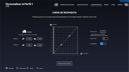 - Asignación completa de todos los botones y de los 4 botones de atajo - Preajustes y configuración manual de la sensibilidad de joysticks y gatillos - Inversión de los joysticks izquierdo/derecho - Cruceta de 4 u 8 direcciones - Iluminación personalizable del joystick derecho - Menú de audio para acceder a los ajustes del ecualizador en función del tipo de juego - Motores de vibración activados/desactivados