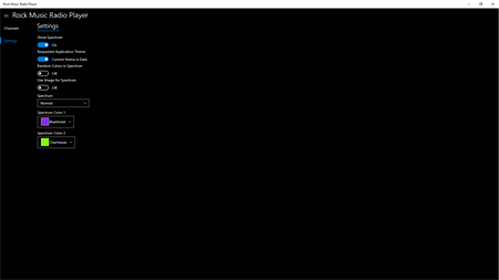 Listen 7885 Rock Music Radio stations all around the world. Search stations and/or add to Favorites List. Customize under Settings Audio Spectrum Analyzer. You could choose random colors or custom colors for displaying Audio Spectrum. You could also choose background picture for Audio Spectrum. Choose Spectrum On/Off or Spectrum size Normal Big or Small.