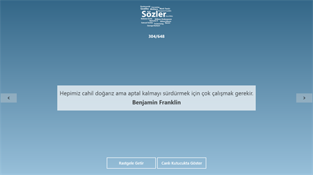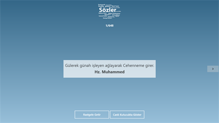 Sözler uygulamasında önemli kişilerin yaklaşık 650 adet güzel sözleri bulunur. Sözleri ister sırayla, ister de rastgele okuyabilirsiniz. Beğendiğiniz sözü canlı kutucuğa ekleyebilirsiniz.